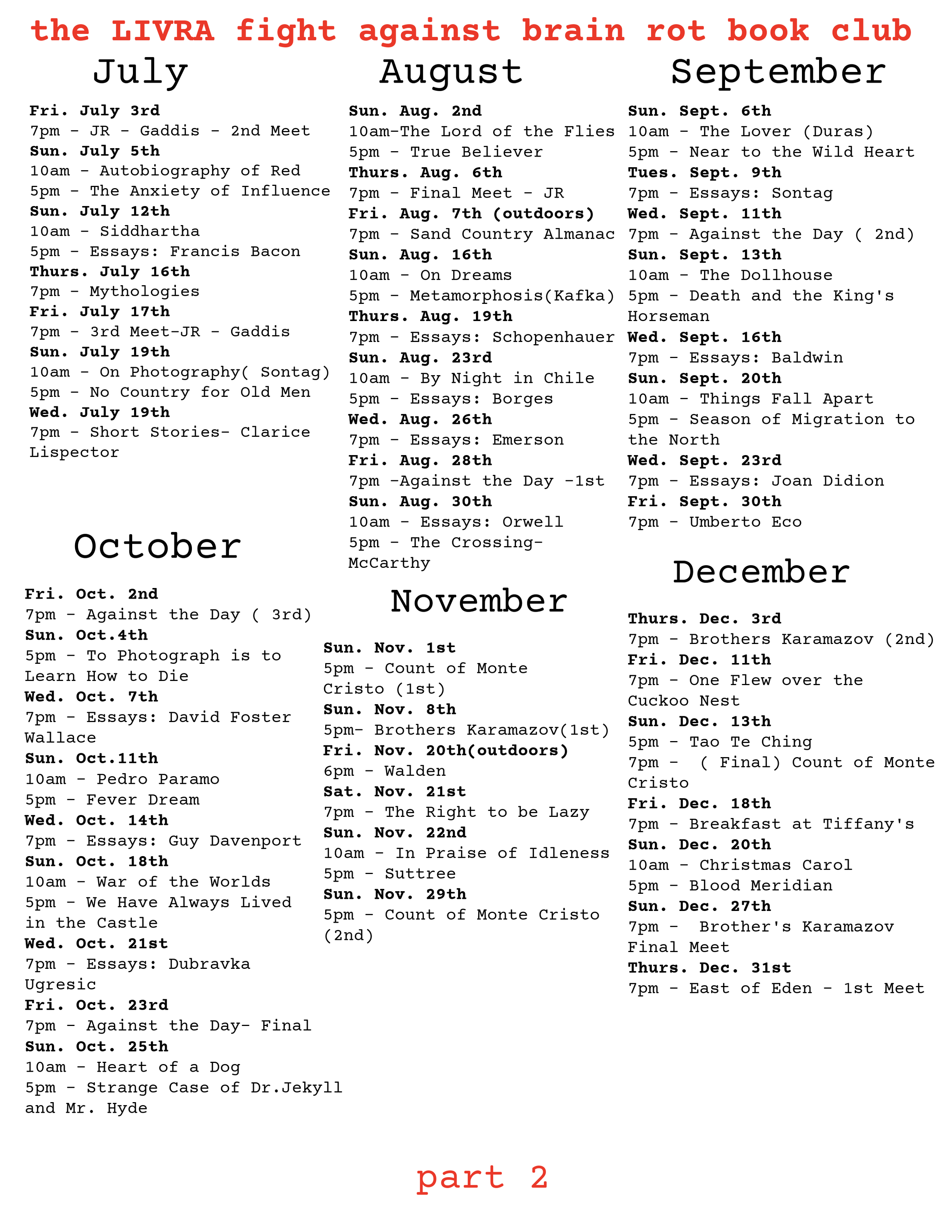 Most books will have just one meeting. Every book club with multiple meetings will be read in parts, the page length will be given a few weeks before the meet via our Instagram stories.